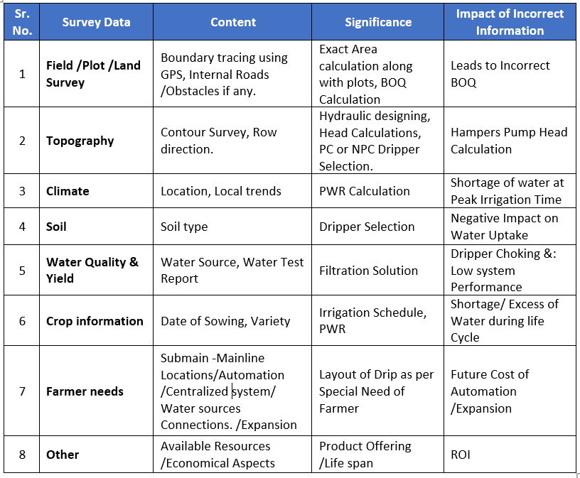 Drip Design is a tailor made because a farmer’s field has different variables like, Filed size & shape, soil type, Undulations of land, Crop spacings, row direction, Water Quality, Electricity available, PWR (Peak Water Requirement of Crop), Farm manager quality etc.